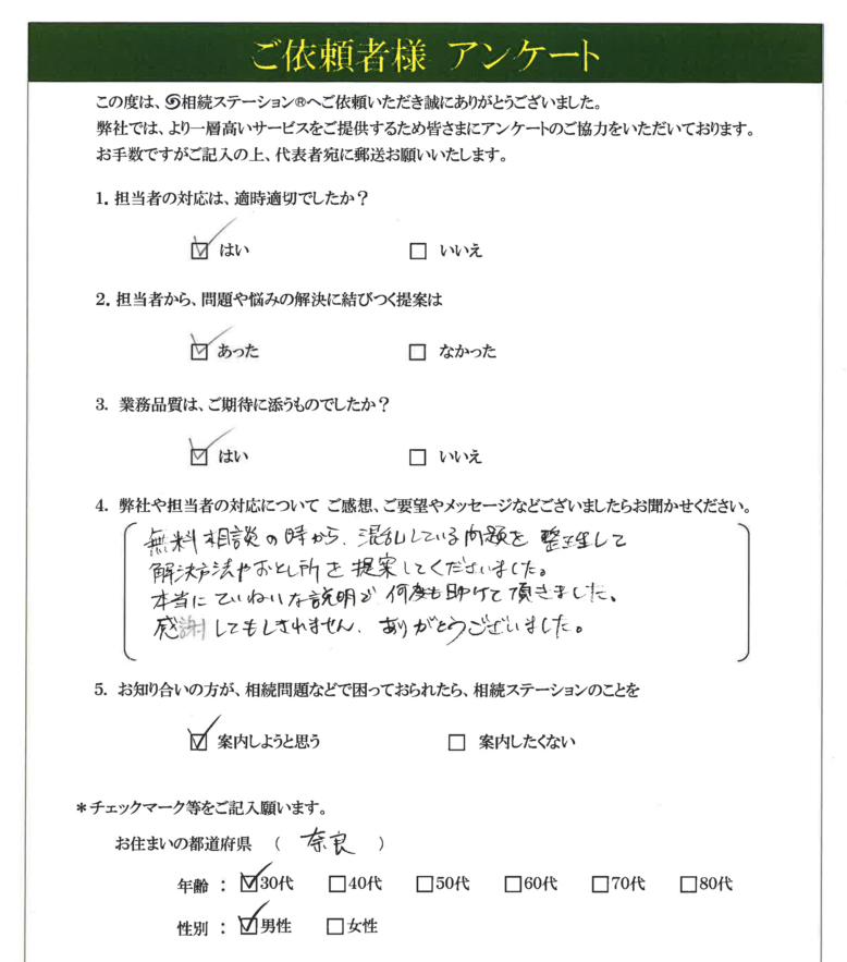 無料相談の時から混乱している問題を整理して解決方法やおとし所を提案して・・・奈良県 30代 男性