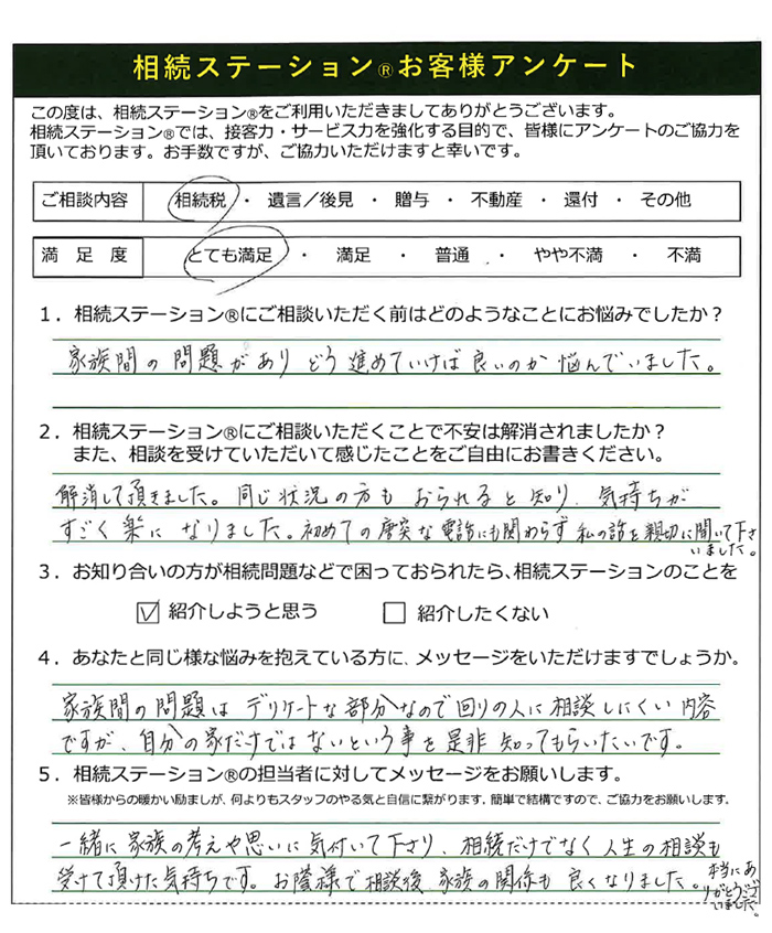 一緒に家族の考えや思いに気付いて下さり、相続だけでなく人生の相談も受けて頂けた気持ちです。お蔭様で相談後、家族の関係も良くなりました。本当にありがとうございました。